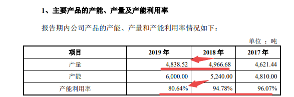此外,招股書還顯示,華光新材主要產(chǎn)品產(chǎn)量2019年比2018年有所下降,從2008年的4967噸下降到2019年的4839噸,產(chǎn)能利用率下跌至80.64%。